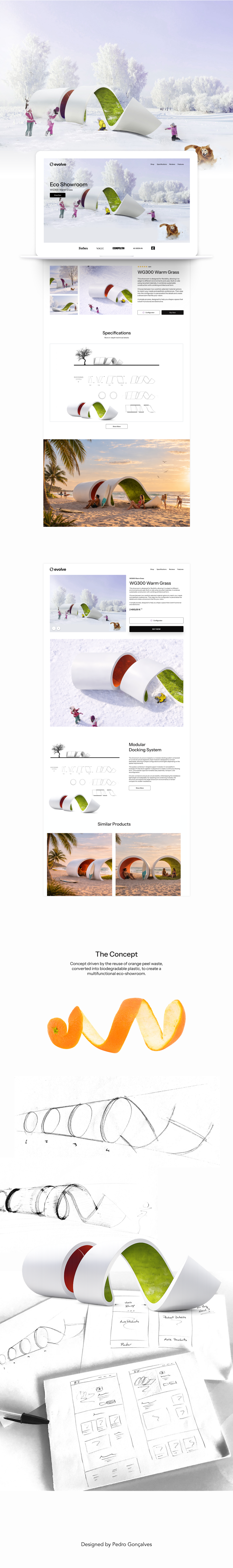 Multifunctional Eco-Showroom made from waste bark of oranges that are converted into biodegradable plastic. Led the entire product development process, from initial concept and 3D modeling to the design and creation of the e-commerce website used to promote and sell the product.